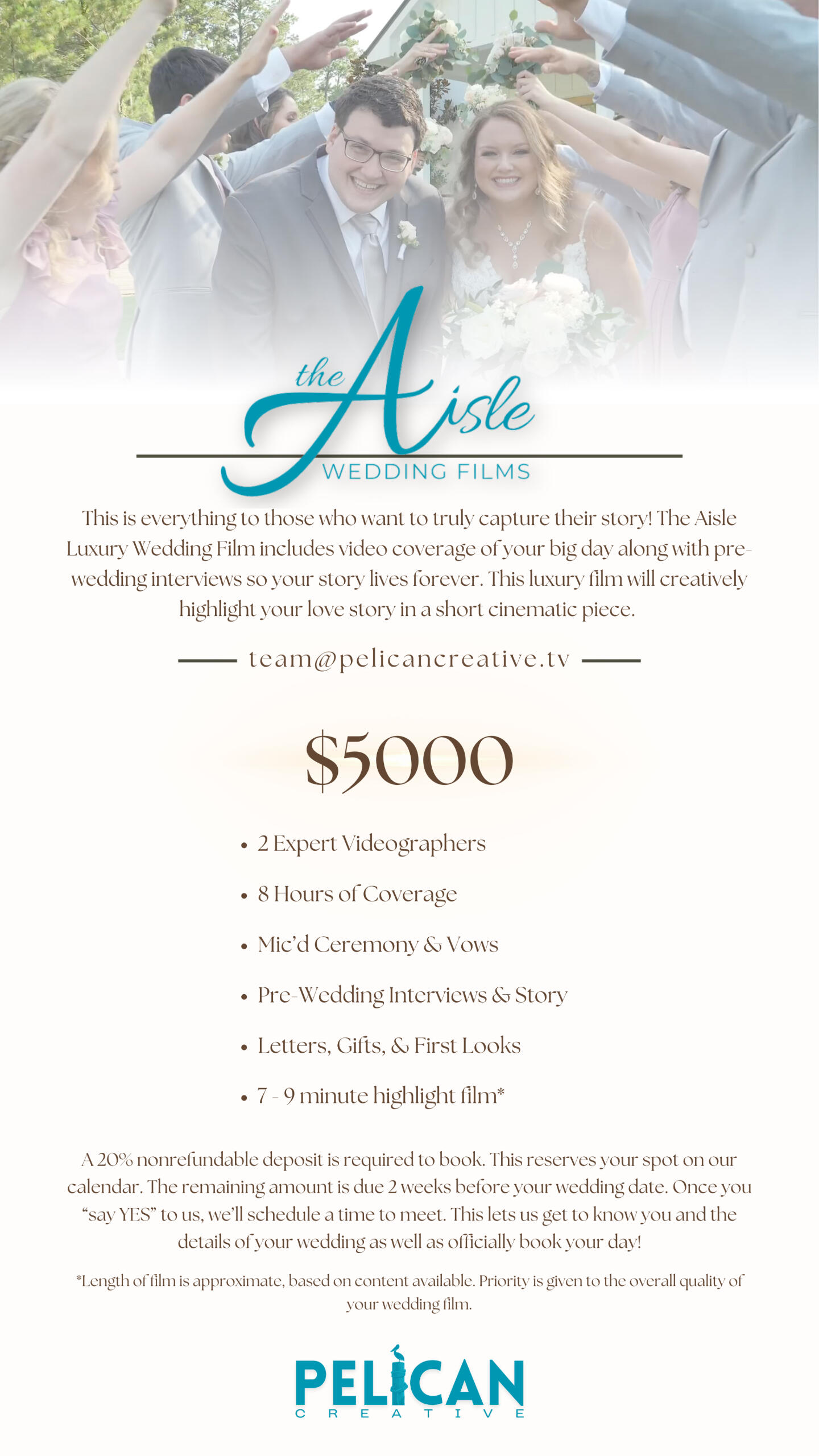 The Aisle Wedding Films is a luxury brand by Pelican Creative that specializes in creating stunning wedding films that beautifully capture your love story. Our process begins with heartfelt pre-wedding interviews, allowing you to tell your unique journey as a couple. On your wedding day, our skilled team documents every cherished moment, from the intimate exchanges to the grand celebrations. We blend cinematic artistry with emotional storytelling to craft a timeless film that reflects your love and the joy of your special day.